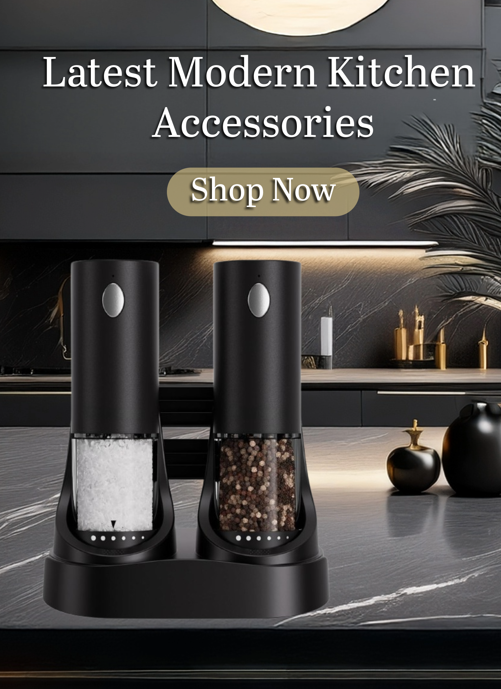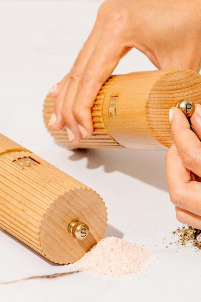 Get ready to elevate your kitchen with our wooden salt and pepper grinder set, accented with luxurious gold detailing.